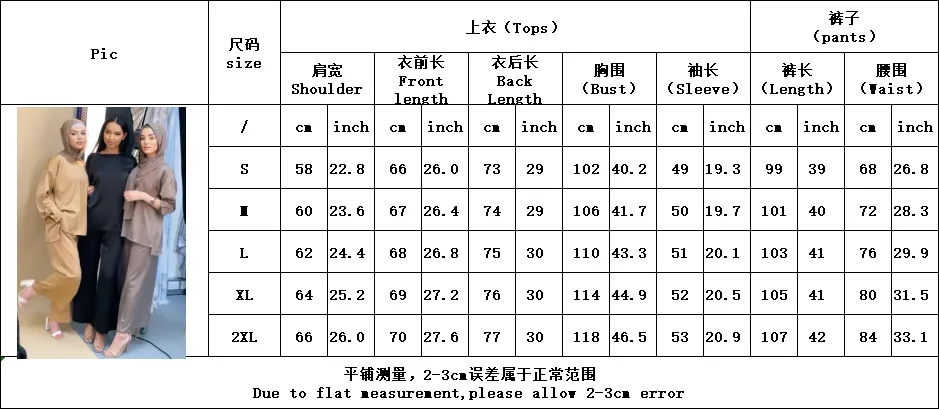 S: ширина плеч 58 см, обхват груди 102 см, рукав 49 см, длина топа 66 см, обхват талии 68 см, длина брюк 99 см