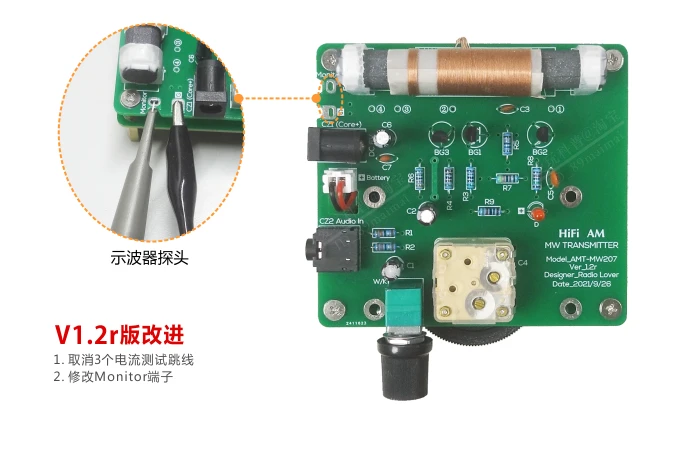 AMT-MW207M-wave передатчик-это простой источник сигнала AM, подходящий для любителей электроники и радио-энтузиастов, он использует магнитный стержень для передачи электромагнитной волны без внешней антенны, где радиосигнал недостаточен, его можно использовать для тестирования обычных средних волн радио и минеральных радио, он также может быть использован в качестве инструмента для отладки средних волн радио.