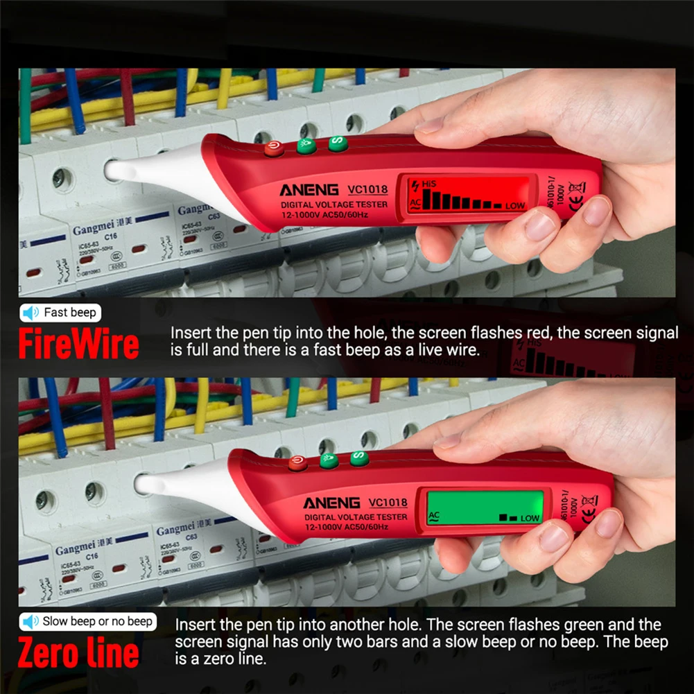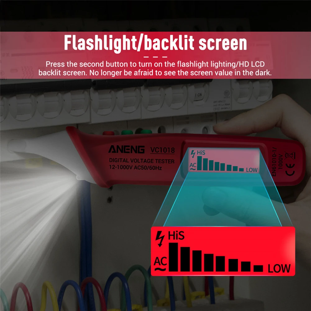 Description: 1. Breakpoint Detection: Detection along the line, where there is no breakpoint, there is a buzzer signal full grid, where the breakpoint is only 2 grids and no buzzer. 2. High-precision Sensor: High-quality PC protective cover, strong and not easy to break, more accurate detection, sensitive/stable/intelligent. 3. Flashlight/Backlit Screen: Press the second button to turn on the flashlight lighting/HD LCD backlit screen. No longer be afraid to see the screen value in the dark. 4. High & Low Sensitivity: Press the "S" button to adjust the high or low sensitivity, the green screen is low sensitivity, and the yellow screen is high sensitivity. 5. Non-contact Detection: When the electric test pen senses the nearby AC voltage, the screen will display red and full signal, and there will be a quick beep. Specification: Model: VC1018 Material: ABS Color: Red, Yellow, Blue Automatic shutdown: 5 minutes (no operation) Battery: 2 X AAA (not included) AC voltage range: 12-1000V AC50 / 60Hz Flashlight: Yes Zero line test: Yes Power failure detection: Yes Sensitivity test: Yes Note: Due to the different monitor and light effect, the actual color of the item might be slightly different from the color showed on the pictures. Thank you! Please allow slightly measuring deviation due to manual measurement.