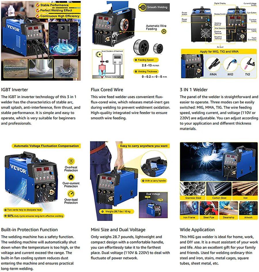 and cast iron. It can work well with MMA MIG TIG function to weld steel and stainless steel perfectly. Gentle Reminder This welder has provided all the accessories that you need. Some accessories may come within the welder's side panel, simply open it to get those accessories.