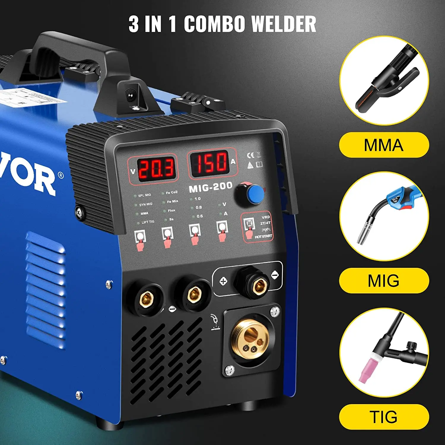 Multifunction 3-in-1 MIG/TIG/MMA professional combo welder, capable of welding up to alloy, mild steel, weld steel, stainless steel, copper,