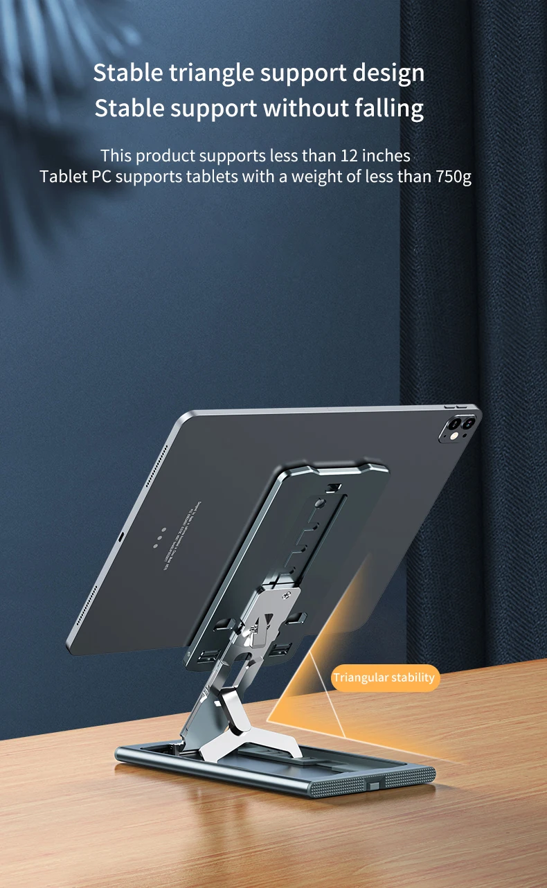 3. Стабильная треугольная опора дизайн: этот продукт поддерживает таблетки с весом менее 750 г до 12 дюймов, И поддерживает мобильные телефоны любого размера.