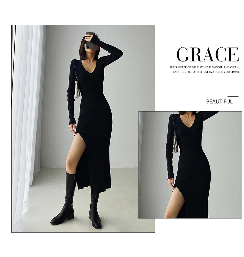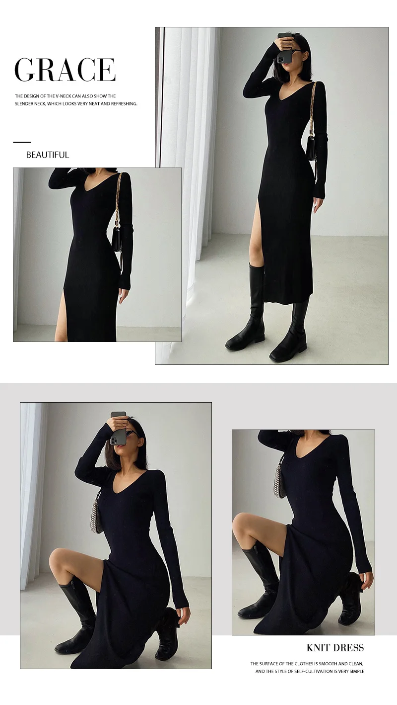 Весеннее и зимнее сексуальное платье-свитер с разрезом, женское облегающее трикотажное платье средней длины выше колена