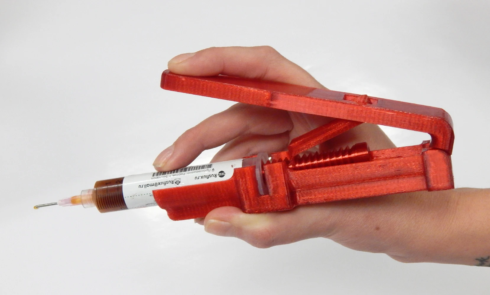 Удобно лежит в руке.Работает по принципу рычага.Одной рукой легко выдавливать флюс, а второй рукой работать паяльником.