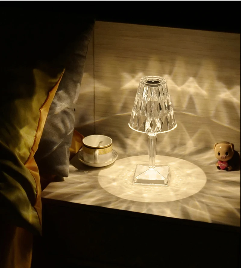 Светодиодная настольная лампа с сенсорным управлением для спальни изготовлена из поликарбоната + прозрачного акрилового материала. Изысканное мастерство делает настольную лампу с сенсорным управлением высококлассной и загадочной. После включения света они разбросаны по земле, а алмазные формы на рабочем столе очень классные.