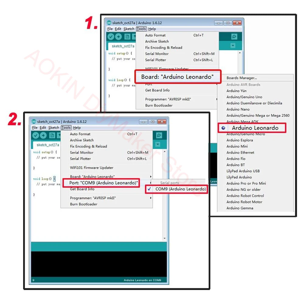 3. Установите доску к Leonardo и выберите соответствующий COM-порт (он показан в списке, который уже обозначен как леондо).