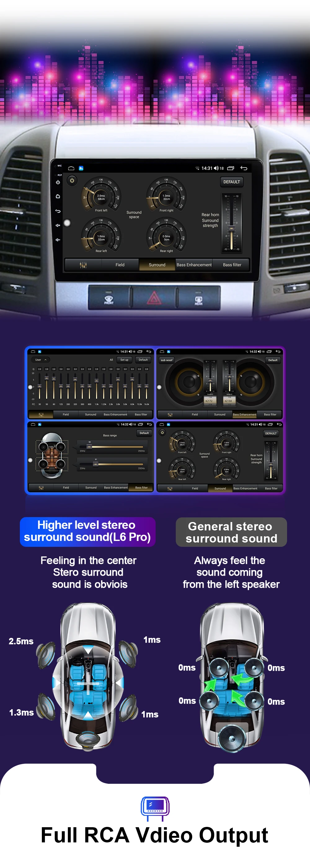 LEHX Pro 5,1 канал DSP, оснащен DTS HiFi цифровым аудио авторизацией. Объемный звук, Trubass, Phantom центр и другими способами, для того чтобы достигнуть 5,1-канальный объемный звук. Эта технология может регулировать объемный звук вверх и вниз, значительно уменьшая собственный шум, максимизируя эффект преобразования звука и позволяя вам наслаждаться высококачественными музыкальными представлениями в автомобиле.