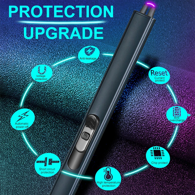 Безопасность: Используйте плазменную технологию для замены вредного Бутана. Тройная защита, вам нужно сдвинуть замок безопасности, долго нажмите кнопку зажигания, зажигалка излучает дугу. По соображениям безопасности электрическая зажигалка автоматически выключается через 5 секунд зажигания. Примечание: он не может быть зажат во время зарядки.