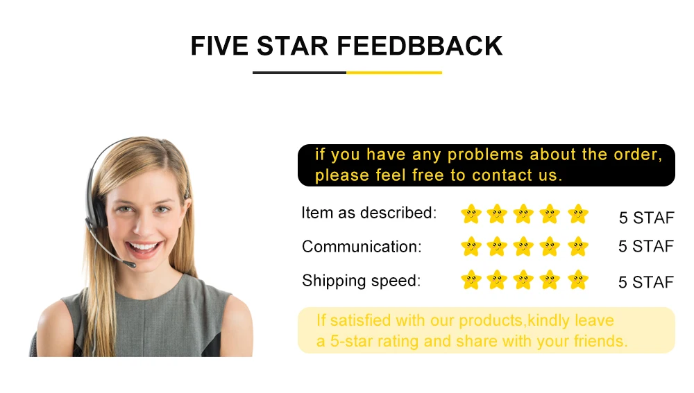 Мы поддерживаем высокие стандарты качества и стремимся к 100% удовлетворенности клиентов! Отзывы очень важны. Мы просим Вас связаться с нами немедленно, прежде чем дать нам нейтральные или отрицательные отзывы, чтобы мы могли удовлетворительно решить ваши проблемы. Невозможно решить проблемы, если мы о них не знаем!