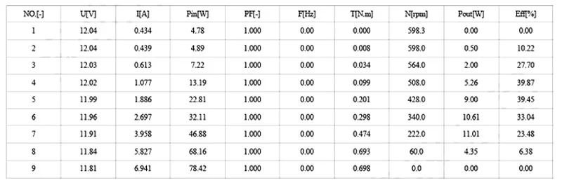 Ниже приведены тестовые данные 12 В постоянного тока, Скорость без нагрузки 600 об/мин.