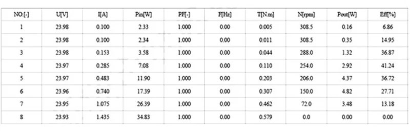 Ниже приведены тестовые данные постоянного тока 24 В, Скорость без нагрузки 300 об/мин.