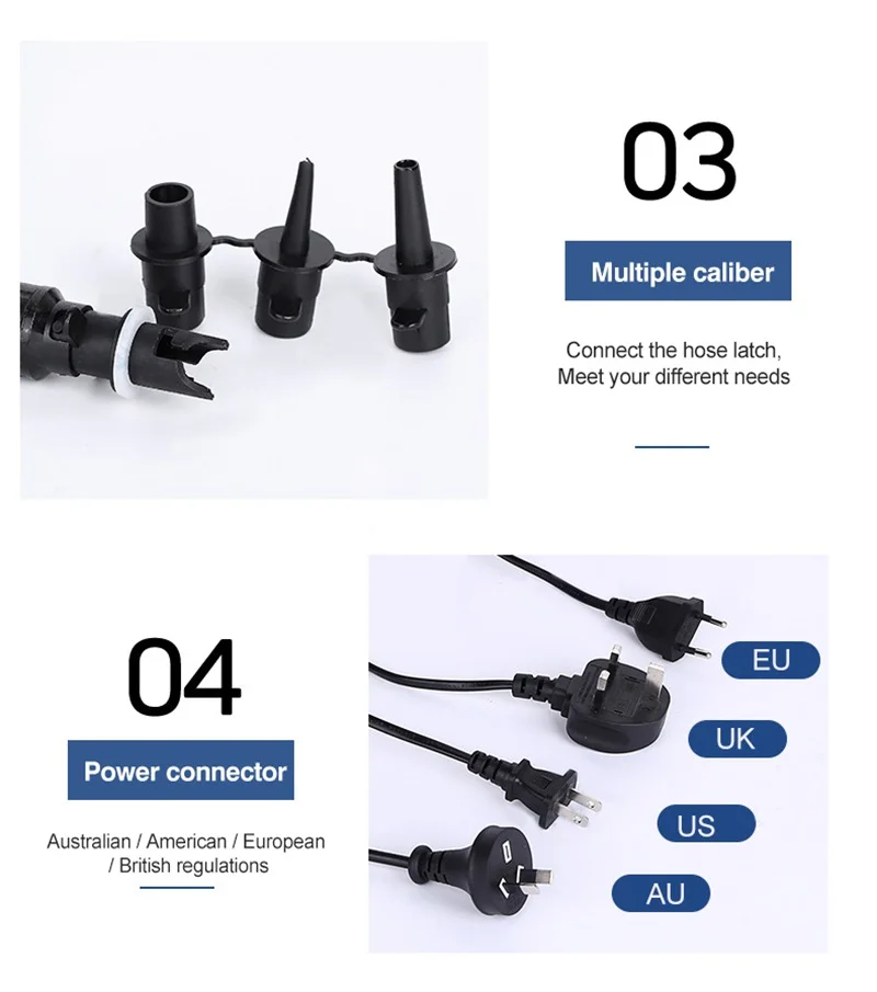 4. Чтобы быстро надуть и сократить время работы двигателя, подходящий адаптер должен использоваться в соответствии с размером надувного изделия