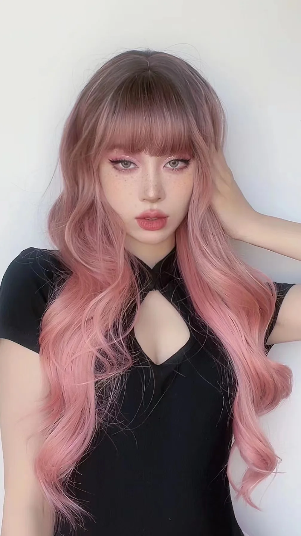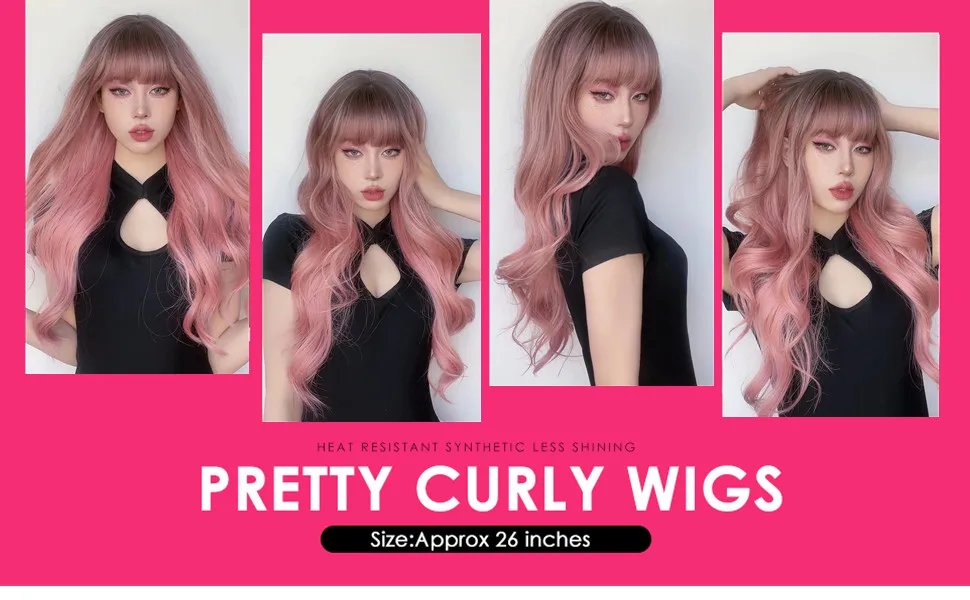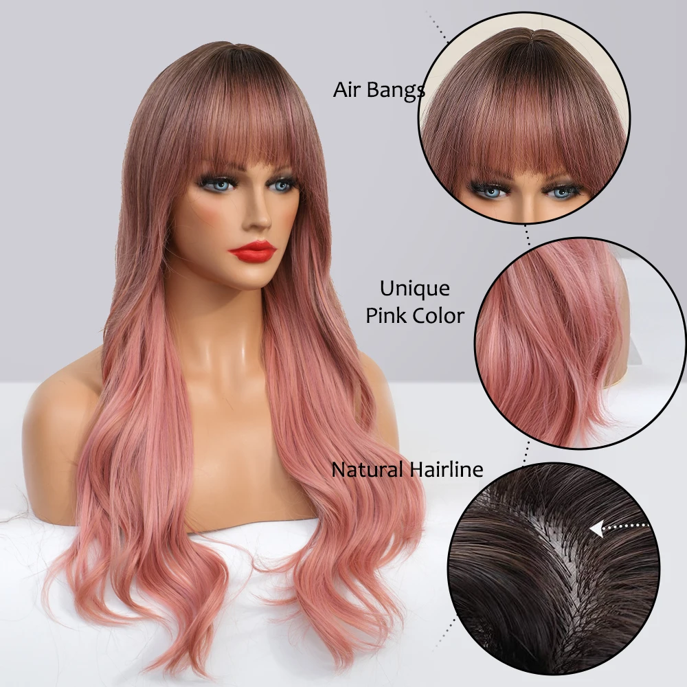 Розовый парик с челкой, косплей, теплый, синтетический парик, натуральный, Омбре, розовое золото, длинные, волнистые, жара, искусственные волосы для женщин, на каждый день