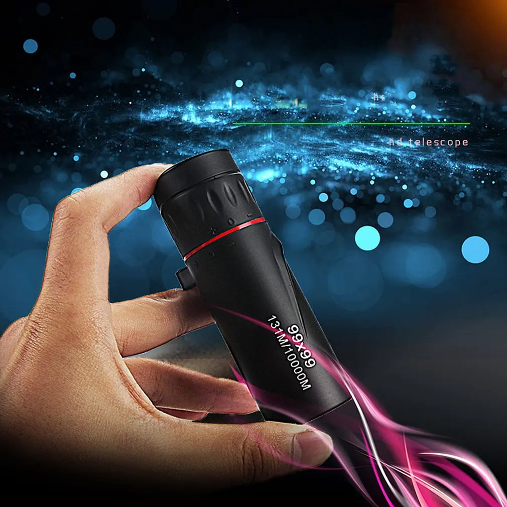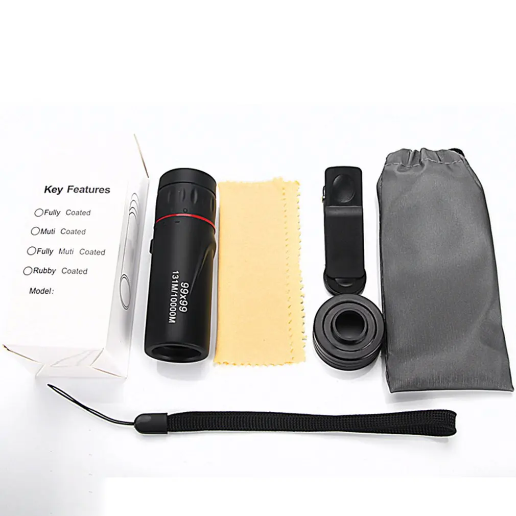 Features: 1. Light and thin: preferred material, light and comfortable, reduce the pressure on the beam when wearing. 2. Safety protection: high quality resin lens, not easy to break, safety performance 3. Clarity: high transmittance, clear vision, enjoy new visual experience. 4. Double anti protection: block harmful light and protect your eyes 5. Application: suitable for sports events, concerts, bird watching, camping, fishing, golf and travel. Description: This single telescope is suitable for sports events, concerts, bird watching, camping, fishing, golf and travel. Specifications: Product color: black Objective lens diameter: 21mm Eyepiece diameter: 10mm Product viewing angle: 7° Commodity field of view: 131m/10000m Product size: 5*5*11cm Lens material: optical glass Mirror body material: rubber material Type:Neutral single telescope Magnification: 90 * 90 Package Included: 1 * Telescope(optional) /1 * Telescope+1 * Simple folder