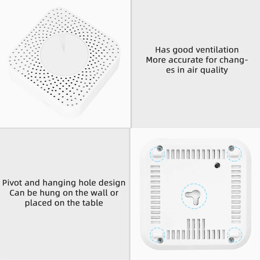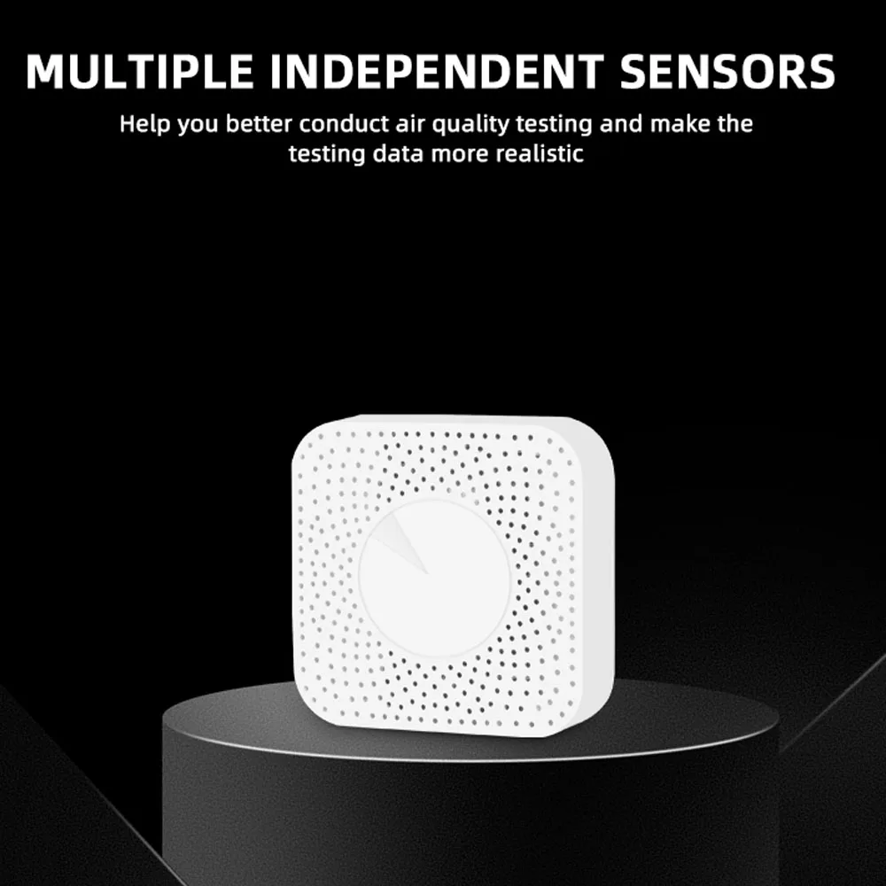 Умная воздушная экономка, Интегрированная функция обнаружения формальдегида/VOC/CO2/температуры/влажности/PM2.5 шесть в одном, удобная и практичная, удаленный просмотр параметров воздуха через приложение Tuya, интеллектуальная связь с кондиционерами воздуха, вентиляторами свежего воздуха, увлажнителями, очистителями воздуха и другими бытовыми приборами для оптимизации воздушной среды, защиты здоровья семьи во все времена.
