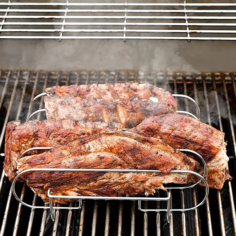 Ребристая стойка может легко удерживать 4 сочные ребристые плиты, так как она измеряет также включает в себя две удобные ручки для удобной маневренности. Наш гриль также подходит для бытовых печей и курительных машин. Это идеальная ребристая стойка для любых целей и случаев. Идеально подходит для вашего Ребристого гриля.