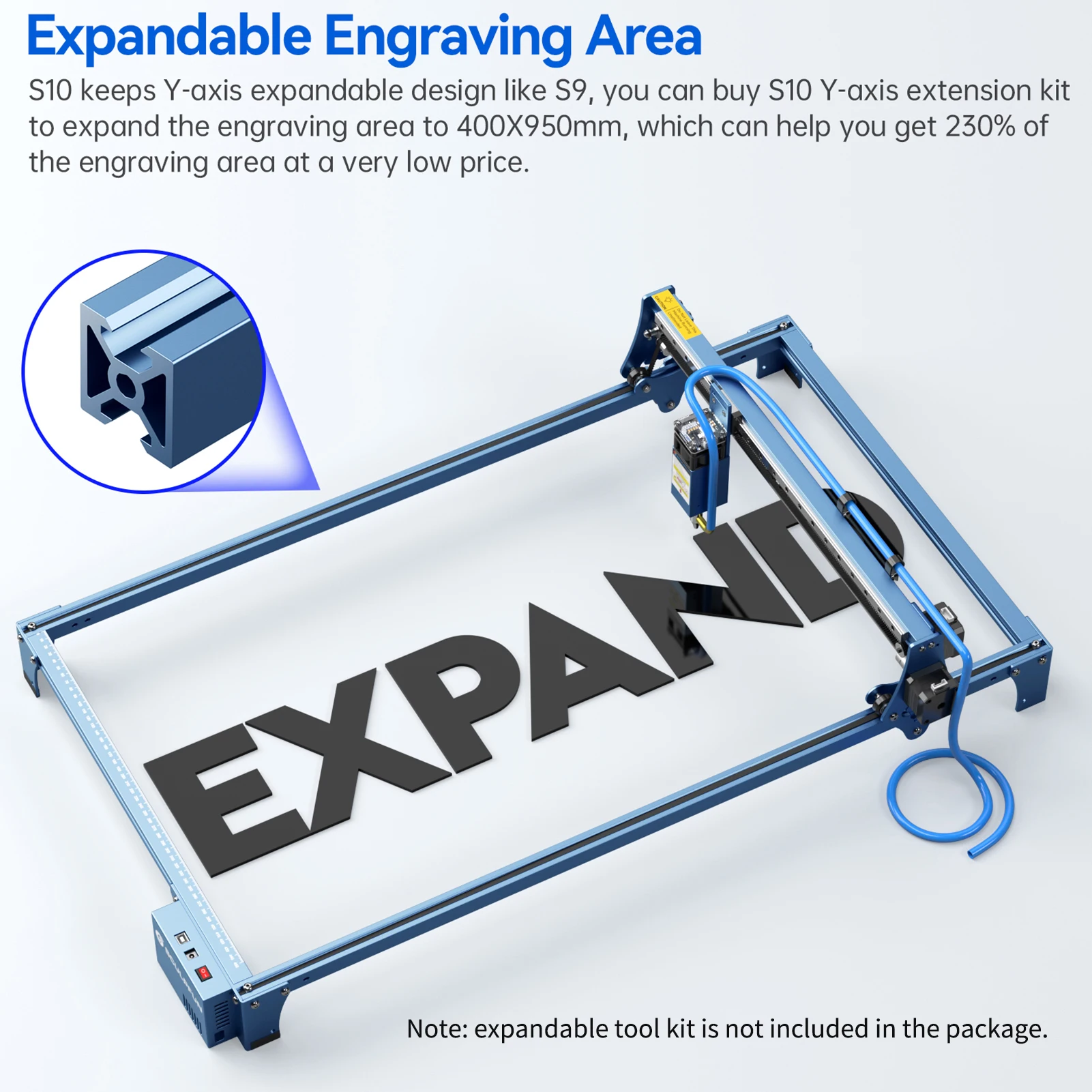 S10 поддерживает Y-axis расширяемый дизайн как S %, вы можете купить S10 Y-axis extension kitto расширить площадь гравировки до 400x950 мм, что поможет вам получить 230% гравировальной площади по очень низкой цене