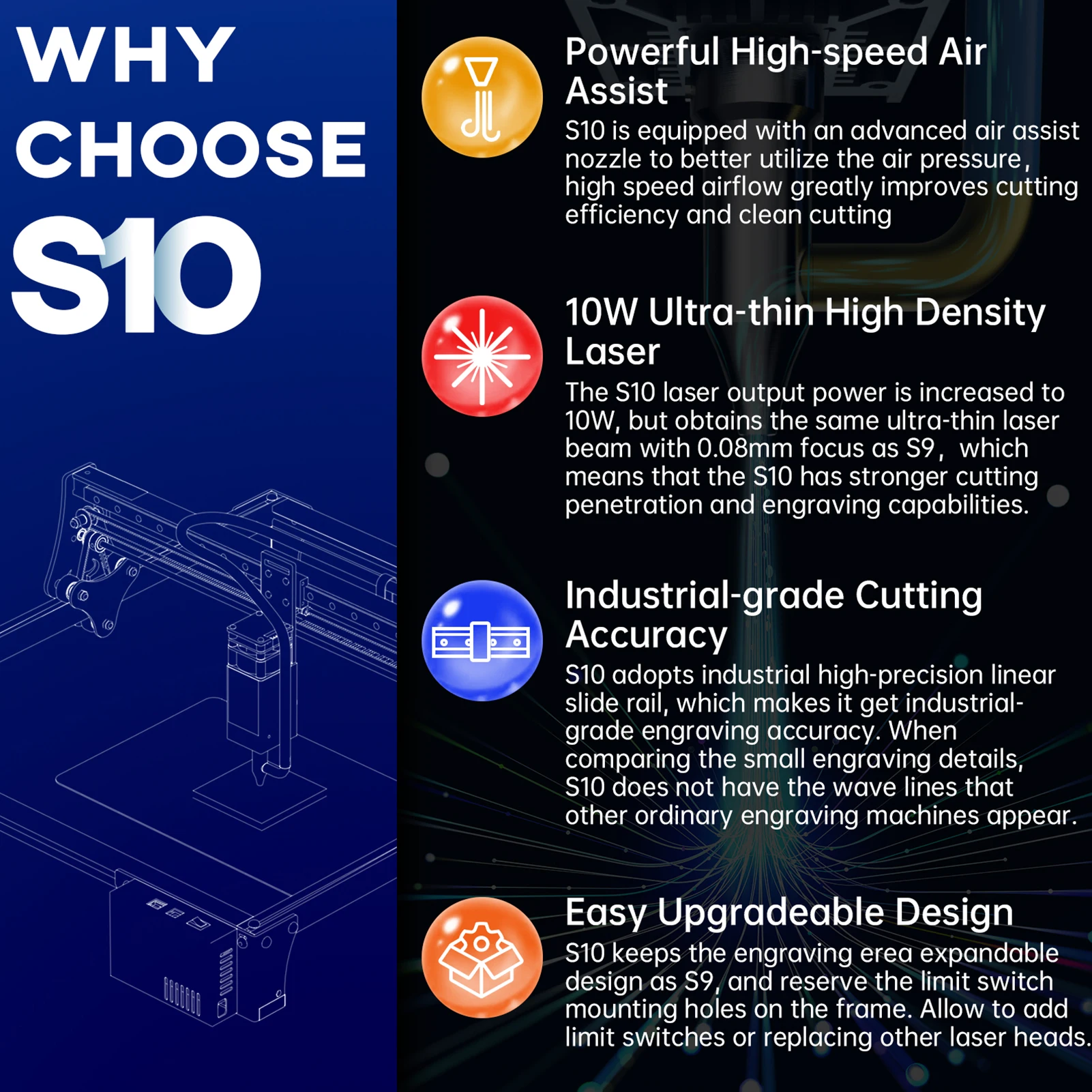 Выходная мощность лазера S10 увеличена до 10 Вт, что в два раза больше, чем у S9. Но S10 получает один и тот же ультра-тонкий лазерный луч с 0,08 мм основное направление деятельности в S9, что означает, что S10 обладает более высокой плотности энергии, более резка проникновения и гравировка возможностей.
