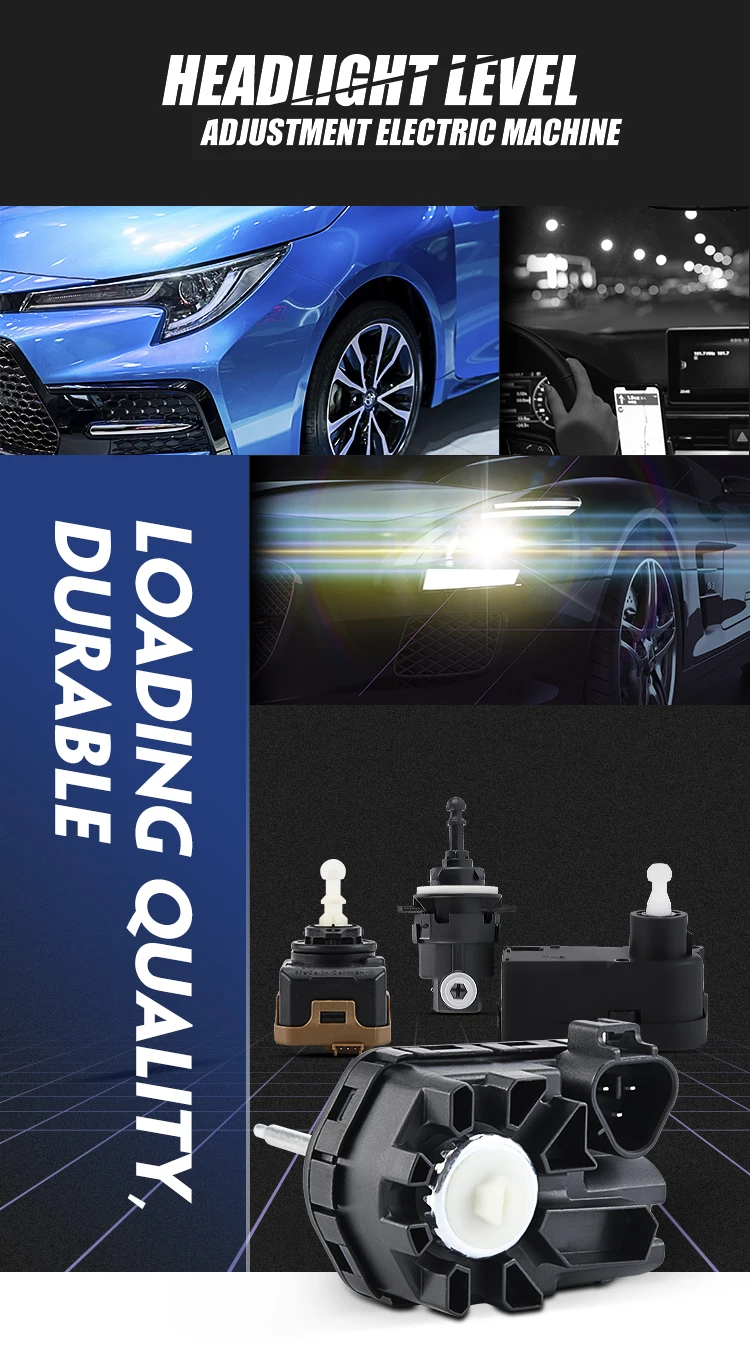 Регулировка уровня фар: переключатель регулировки установлен на приборной панели автомобиля. Как правило, есть 5 передач: 0, 1/2/3/и шестерня по умолчанию. Диммирующий двигатель установлен в фаре автомобиля. Диммирующий двигатель винт выталкивается на внешнюю отражающую поверхность фары. С регулировкой переключателя, совместная винт затемнения мотор расширяется и сжимается ездить на отражающую поверхность головной светильник для того, чтобы регулировать фокусное расстояние отраженного светильник для того, чтобы добиться эффекта Регулировка головной светильник.