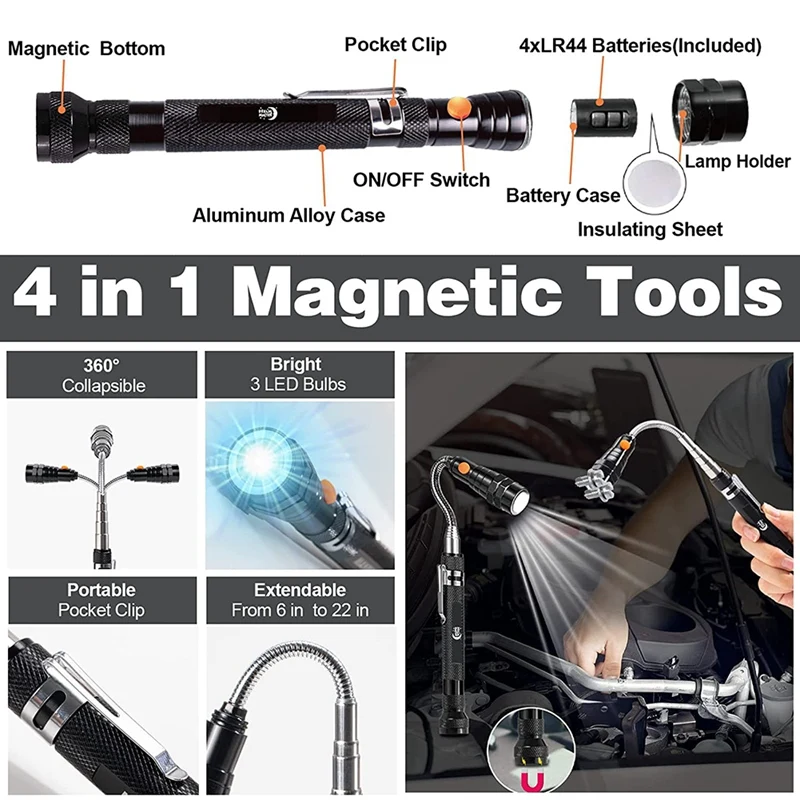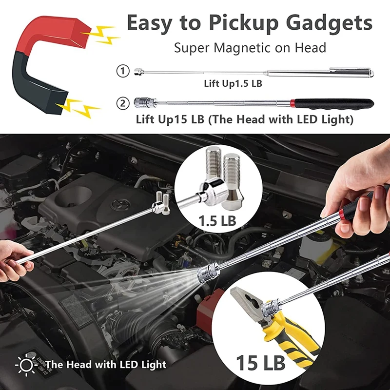 Сильная Магнитная головка и телескопическая ручка: 2 стержня, магнитный фонарик с магнитной головкой. Они легко захватывают металлические гайки, болты, винты и другие металлические детали. Они являются отличными инструментами для сбора.