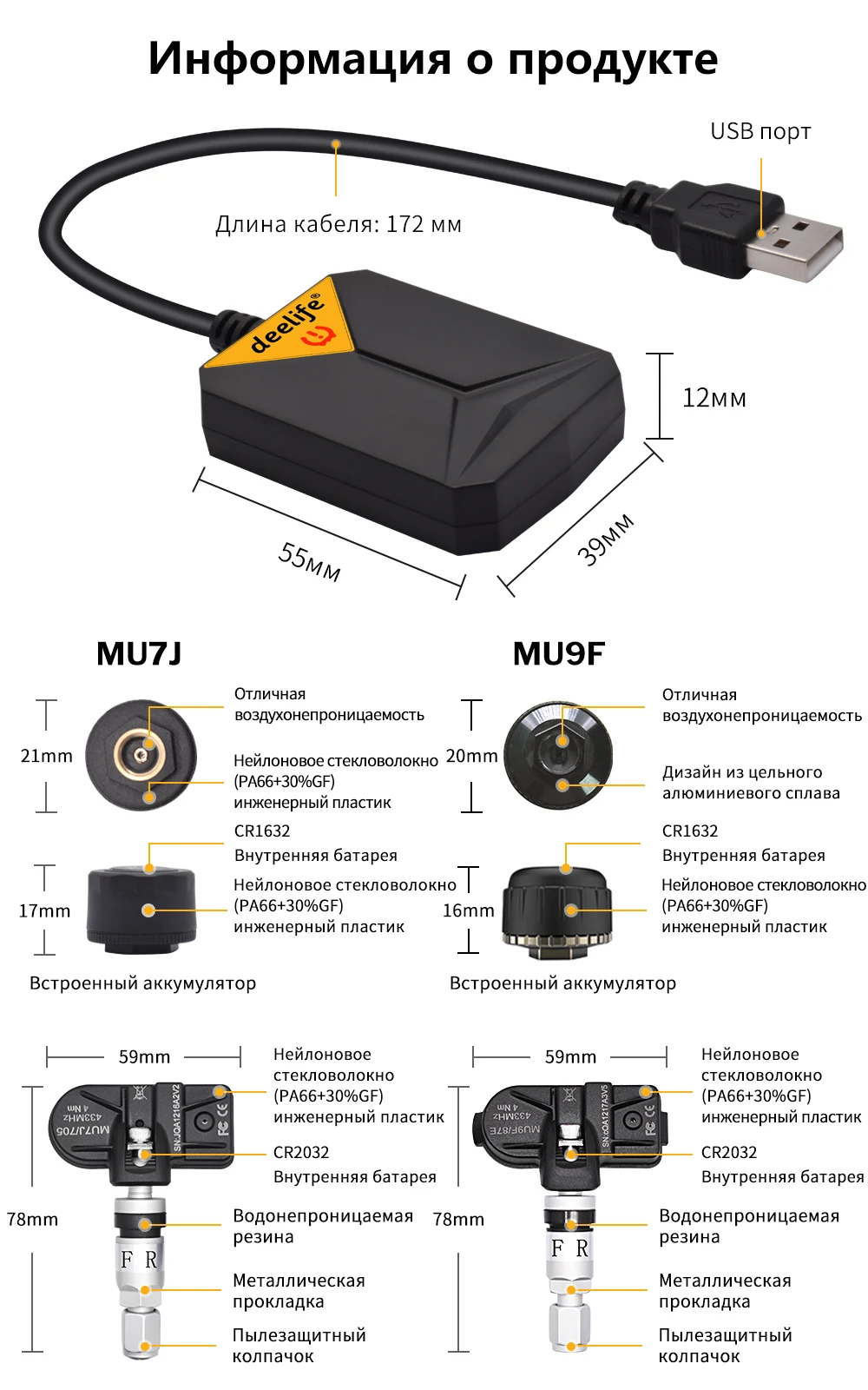 - Поддержка запасного колеса- Поддержка смены летних/зимних колес с помощью двух наборов сенсоров- Широкий диапазон настройки контроля давления (от 0 до 8 бар) TPMS для DVD / Навигацииавтомобиляна Android- Приемник TPMS может быть подключен к машинному DVD на базе Android через USB порт- Значения давления и температуры в шинах выводятся на экран DVD автомобиля на базе Android- Звуковое оповещение через динамики автомобиля и экранное оповещение при возникновении неисправности- Предотвращает разрыв шины, продлевает срок службы шин и экономит топливо Отличнаяфункцияобнаружениядвижения (только MU9F)- Датчик включается автоматически, как только колесо начинает вращаться- Быстрое обновление значений давления и температуры в шинах в приложении Android TPMS App- Автоматически перестает работать после парковки для экономии энергии Защита для безопасного вождения① Оповещение о высоком давлении② Оповещение о низком давлении③ Оповещение об утечке воздуха④ Оповещение о высокой температуре⑤ Оповещение о низком заряде батареи⑥ Оповещение об отключении датчиков Высокая точность и высокое качество (только MU9F)① Проверенная на практике архитектура двухосного акселерометра② Ось XZ позволяет обнаружить движение③ Таймер пробуждения с низким энергопотреблением, автономный счетчик и периодический сброс приводятся в действие LFO Сменаположенияшиныбезограничений- Специально для внутренних датчиков, нет необходимости удалять датчики- Легко взаимодействие с нашим приложением TPMS App Поддержкаязыков- Английский, русский, украинец,испанский, немецкий, итальянский, португальский, японский, вьетнамский, упрощенный/традиционный китайскийВнимание: