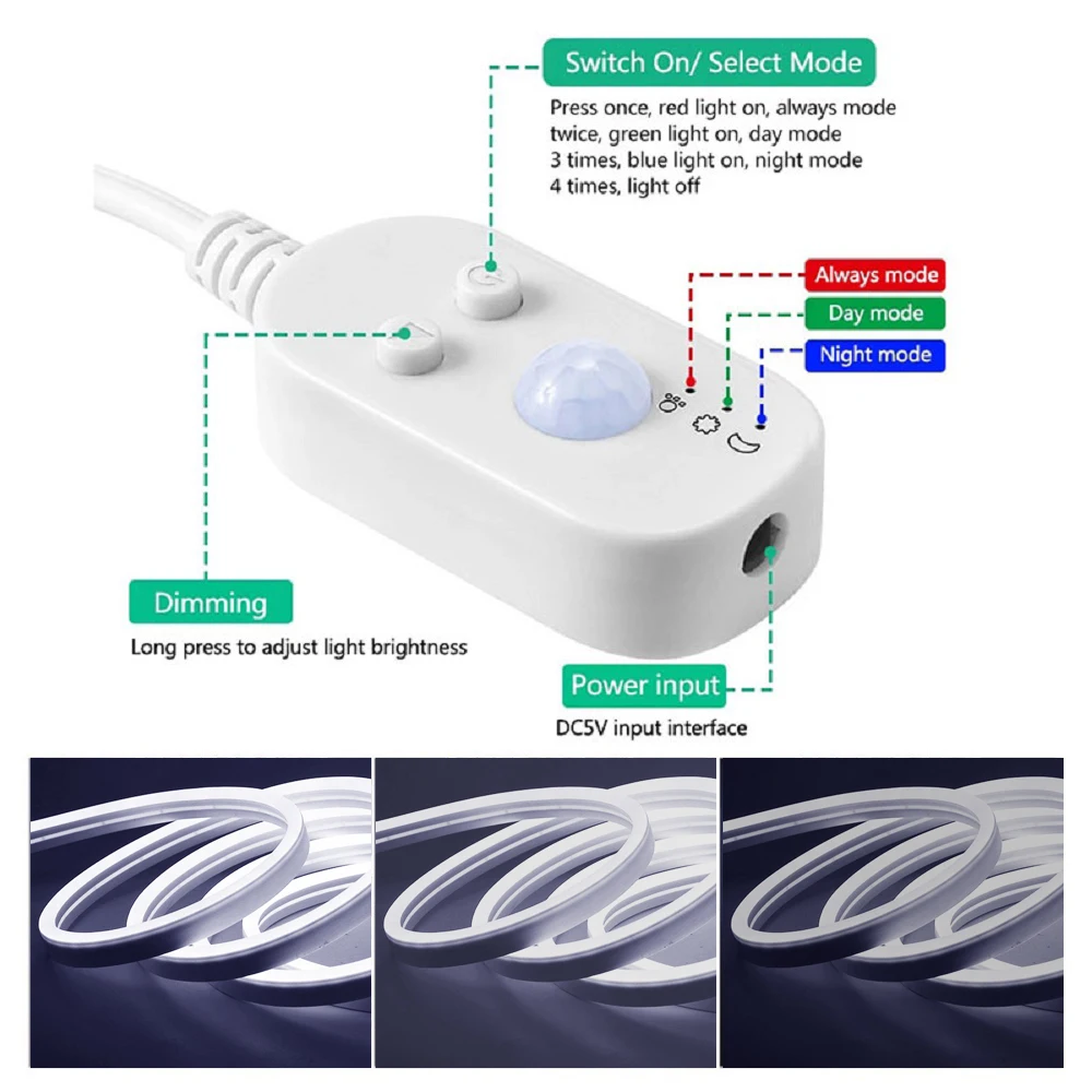 * Пожалуйста, dНе подключайте напряжение DC12-24V или 110-240 В переменного тока (выше 5 В), в противном случае неоновый светодиодный светильник может быть поврежден.