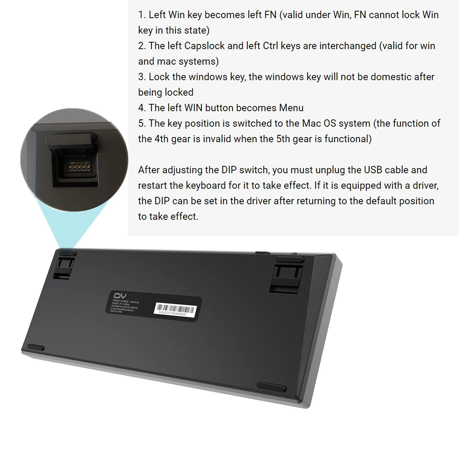 После настройки DIP-переключателя необходимо отключить usb-кабель и перезагрузить клавиатуру, чтобы она начала действовать. Если он оснащен драйвером, DIP может быть установлен в драйвере после возвращения в положение по умолчанию, чтобы начать действовать.