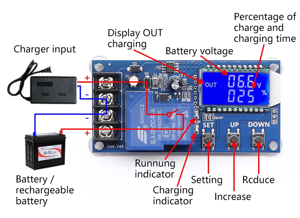 Установив volt-HI:'UP' volt-LI:'dn'; Когда напряжение батареи ниже Вольт-LI:'dn', реле приводит, зарядное устройство начинает заряжать аккумулятор; когда напряжение батареи до Вольт-привет: «вверх», реле diconnected и автоматическая зарядка завершена один раз