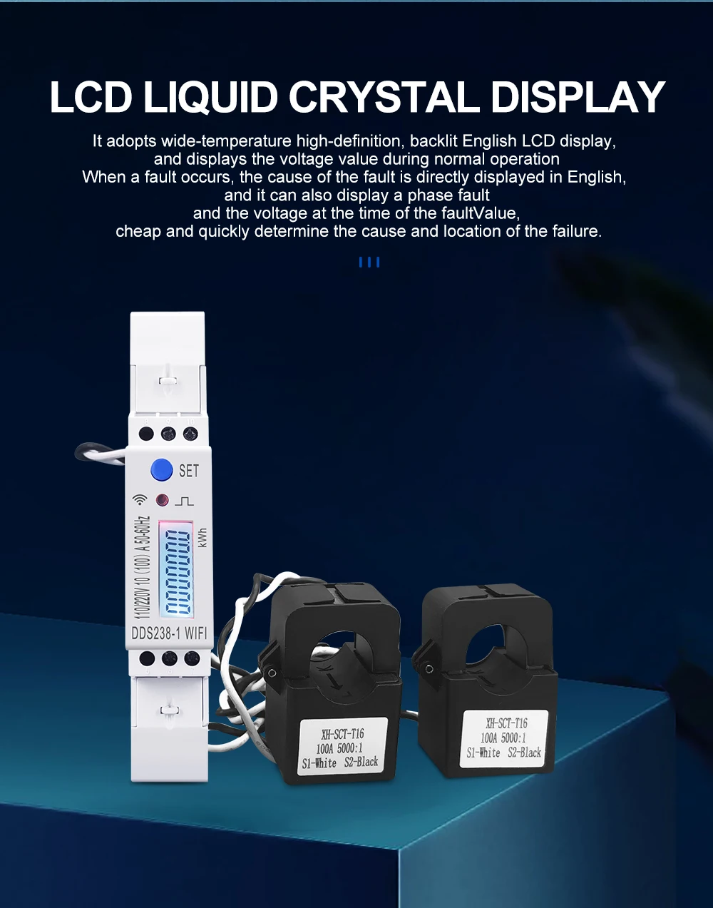 3. ЖК-дисплей, отображение в реальном времени напряжения, тока, активной мощности, реактивной мощности, мощности завода, частоты, общей энергии кВт · ч