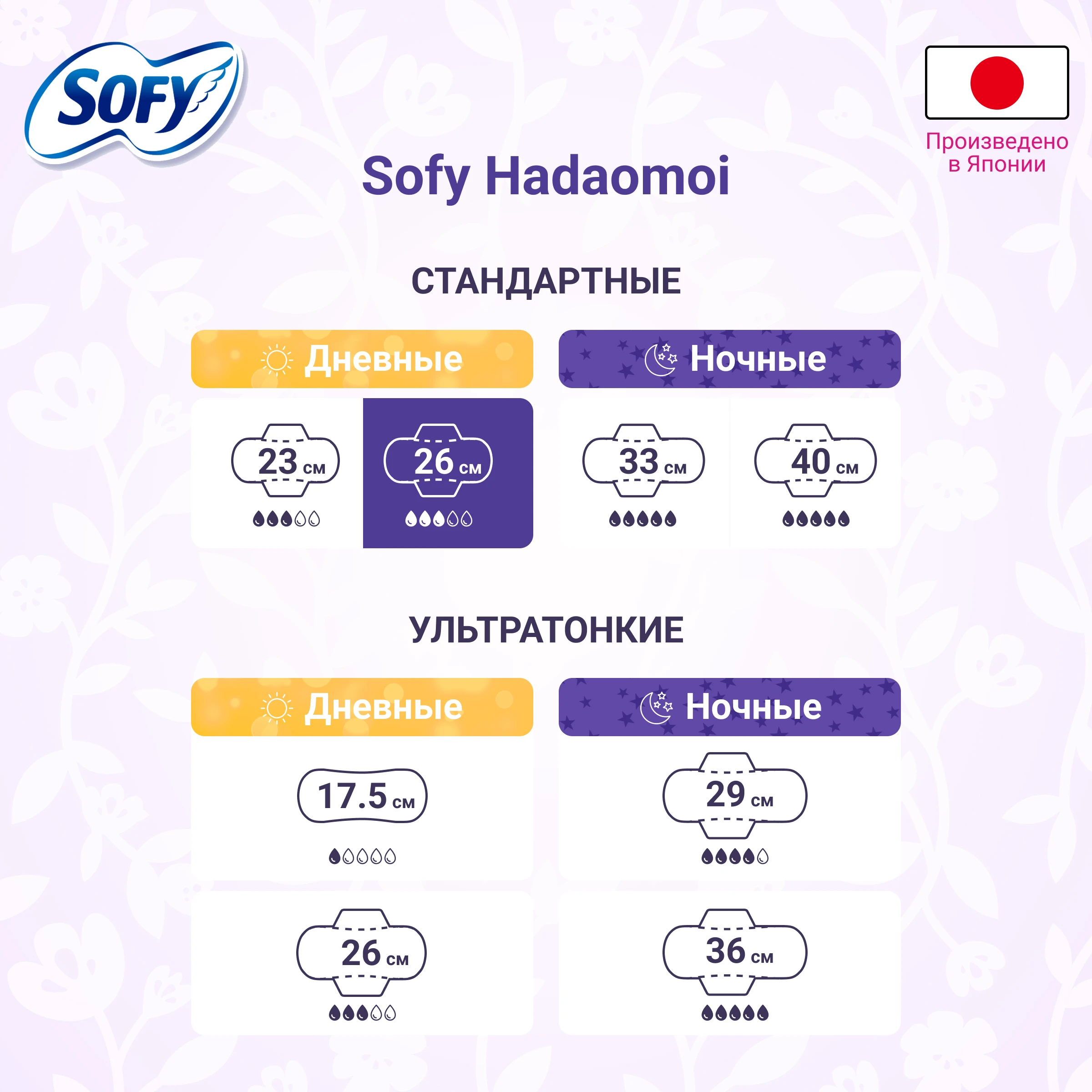 Японские женские гигиенические прокладки SOFY Hadaomoi 26 см, с крылышками, без отдушек. Рекомендованы для использования днем, при особенно обильных выделениях. Благодаря инновационной технологии (впервые используется в гигиенических прокладках), мягкая ребристая структура поверхности прокладок SOFY Hadaomoi, позволяет уменьшить площадь соприкосновения с кожей при этом моментально впитывает даже густые выделения, практически не оставляя их на поверхности. Прокладка бережно соприкасается с кожей не вызывая раздражений, оставляя кожу сухой. Рельефное тиснение на переднем и заднем крае прокладки защищает от протеканий. Высокая впитывающая способность сохраняется в течение длительного времени, а ощущение гладкости останется с вами до самой замены. Симпатичный цветочный принт, порадует вас в столь особенные дни! SOFY- бренд номер 1 в Японии уже 10 лет подряд в категории женских прокладок. Способ применения: снять защитный слой, прикрепить к белью и разгладить пальцами. Меры предосторожности: не допускать попадания в унитаз; если продукт не подходит вашей коже и возникло раздражение, рекомендуем обратиться к врачу. После использования прокладки заверните ее в пакет и выбросьте в мусорное ведро. Хранить в сухом прохладном месте. После вскрытия упаковки не допускать попадания посторонних предметов и насекомых. Состав: полиэстер, полиэтилен.