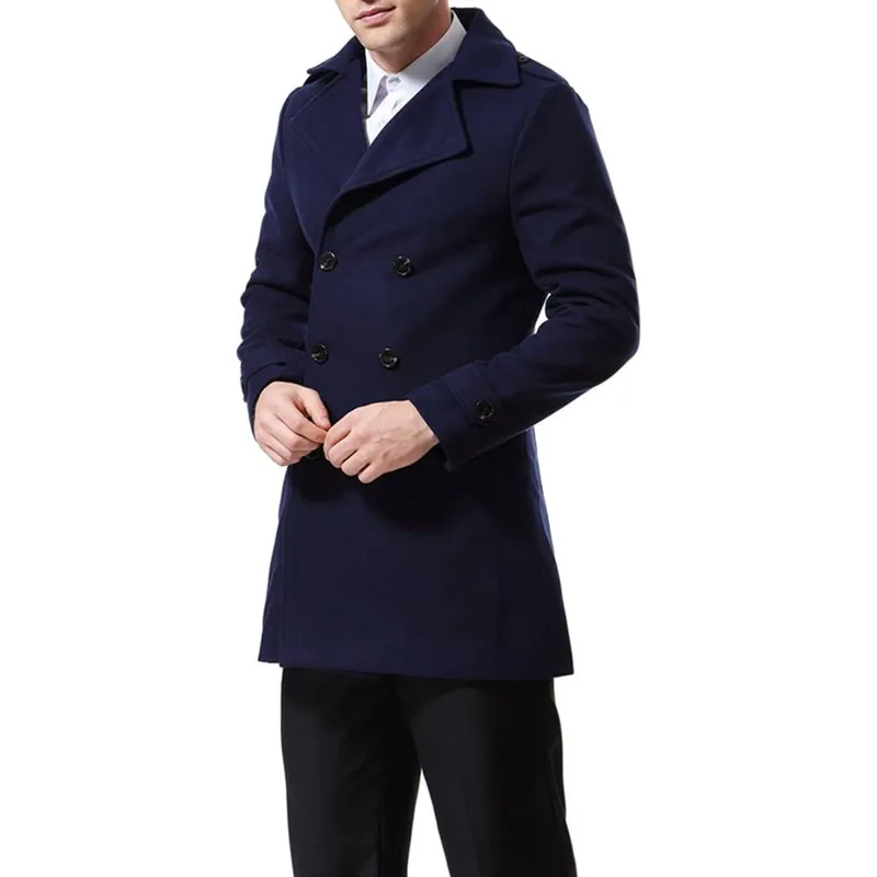 Лидер продаж, мужские темно-синие полупальто с отворотами/модные двубортные шерстяные зимние костюмы, облегающий пиджак/длинное пальто
