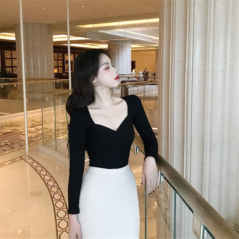 Топ с квадратным вырезом и длинным рукавом, Сексуальная футболка с v-образным вырезом, женская футболка, весна-осень 2022, облегающие тонкие футболки с длинным рукавом
