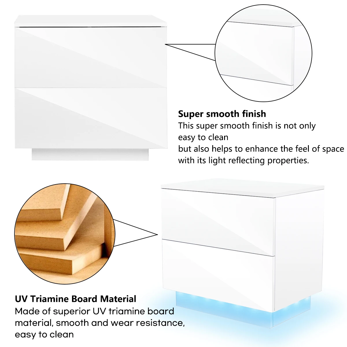 -Прикроватный шкаф поставляется в комплекте с разноцветным (20 цветов) светодиодный подсветкой (пульт дистанционного управления для изменения цвета в комплекте).