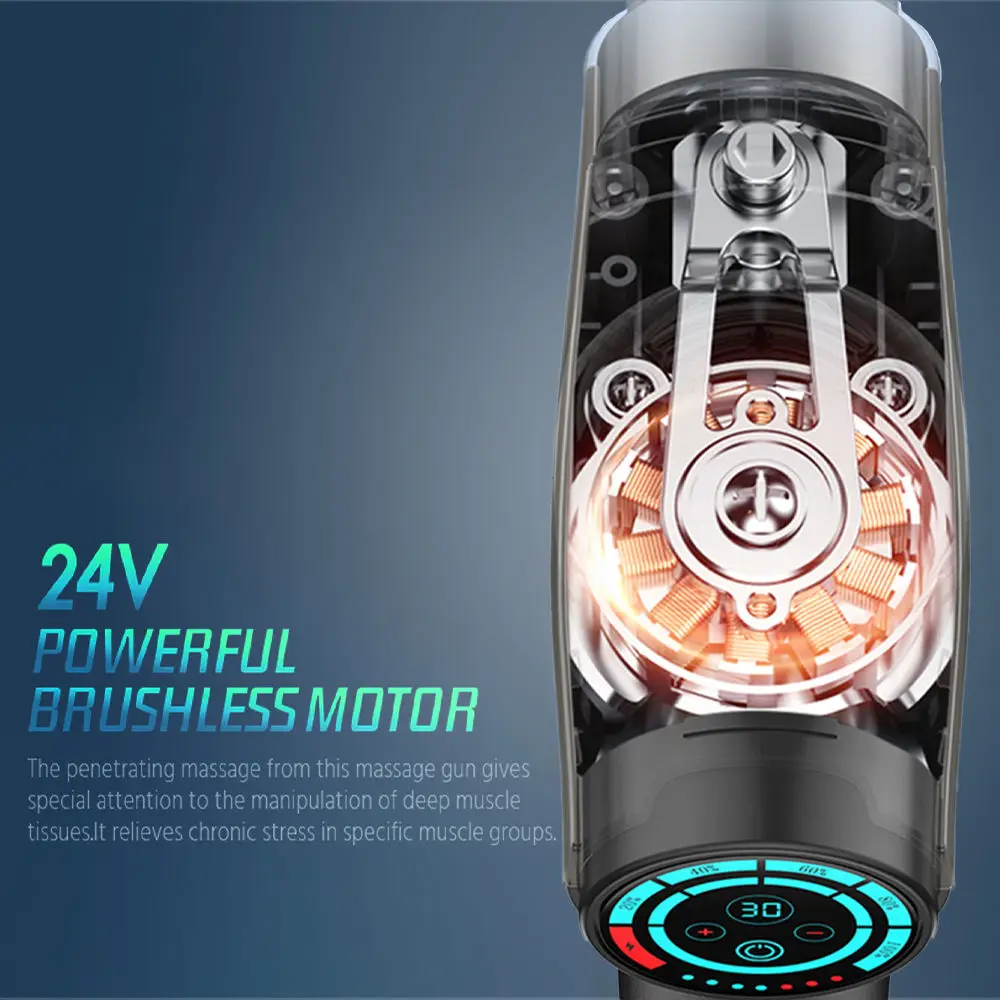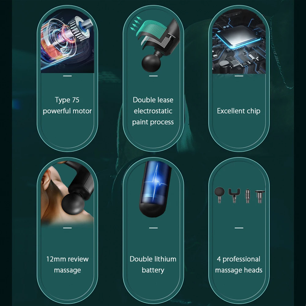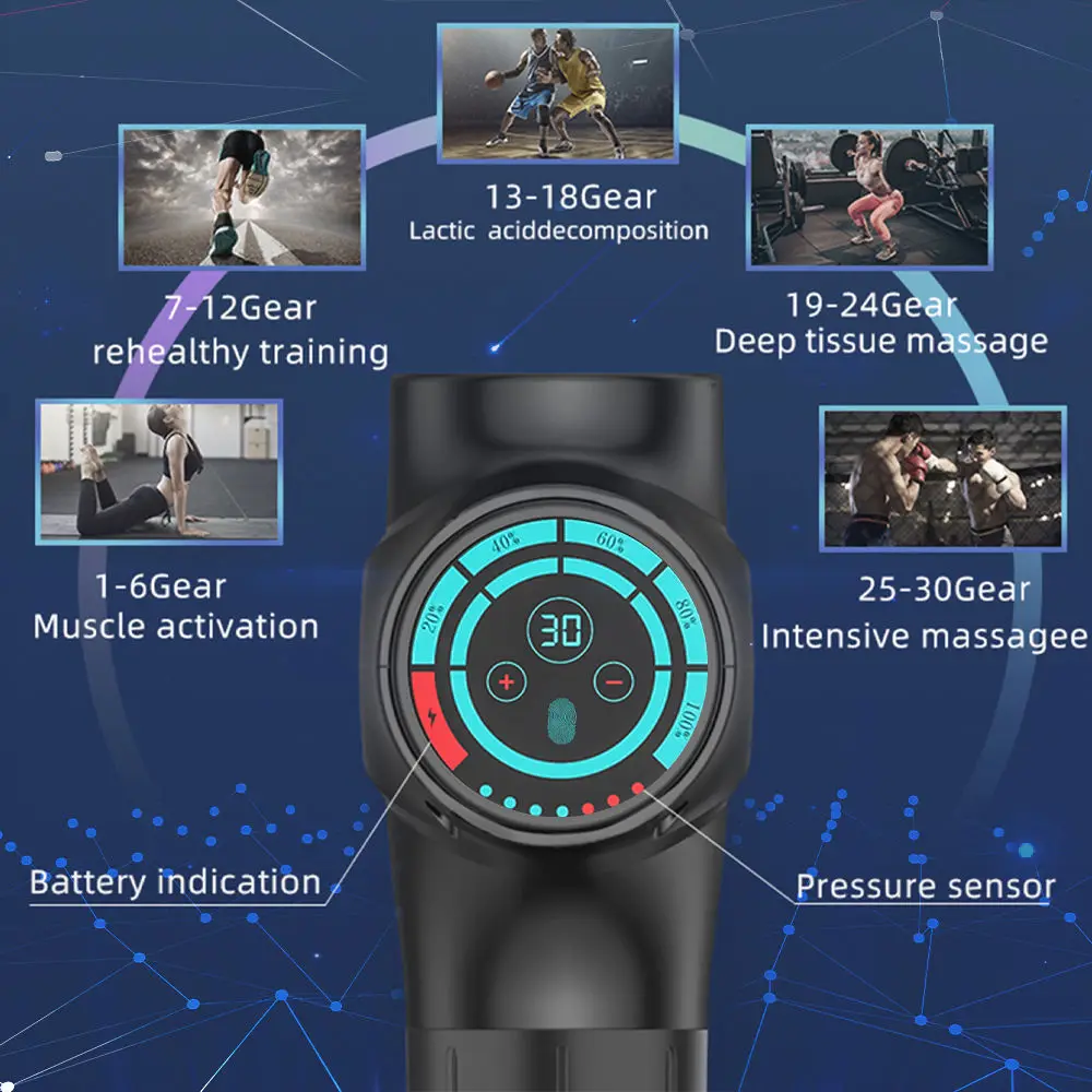 С массажной головкой и массажным телом, плотно Соединенным, обеспечивает минимальный уровень шума во время использования. Он поставляется со встроенным бесщеточным мощным мотором с новейшей технологией шумоподавления с работающим шумом от 25 дБ до 55 дБ. Сенсорный ЖК-экран позволяет легко видеть и контролировать уровни скорости и состояние питания. Функция отвода тепла дает мышечному массажеру более долгий срок службы, охлаждая систему и предотвращая ее перегрев.