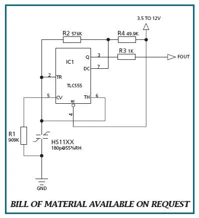 HS1101Frequency output circuit evaluation board,Supply voltage2.5-12V,stay3.3VPower consumption during power supply105uA,All resistors are made in GermanyvishayLow temperature drift resistance,Overall temperature drift of circuit0.005%/℃,Stable frequency output,Even if the connection is too long, the waveform will not deform,After two-point calibration, the accuracy can reach2%,Annual drift not greater than0.5%,measuring range 0-100%