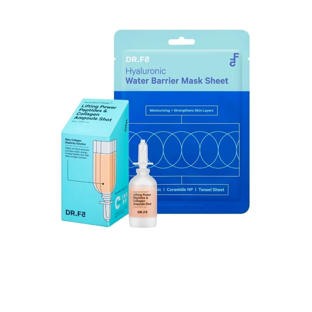 Dr.F5 предлагает вам набор из Лифтинг ампулы-шот с пептидами и коллагеном и Экстра увлажняющая маска с гиалуроном. Аминокислоты и пептиды ампулы-шот борятся с возрастными изменениями, возвращая коже гладкость и эластичность. Активизирует естественную защитную функцию дермы, регенерирует и защищает. Концентрированная формула направлена на моментальное подтягивающее, питающее и смягчающее действие. А маска с гиалуроном притягивает и удерживает молекулы воды, тем самым обеспечивая упругость каркаса кожи и укрепляя его. Экстракты центеллы, камелии и граната борятся со свободными радикалами, защищая от возрастных изменений.