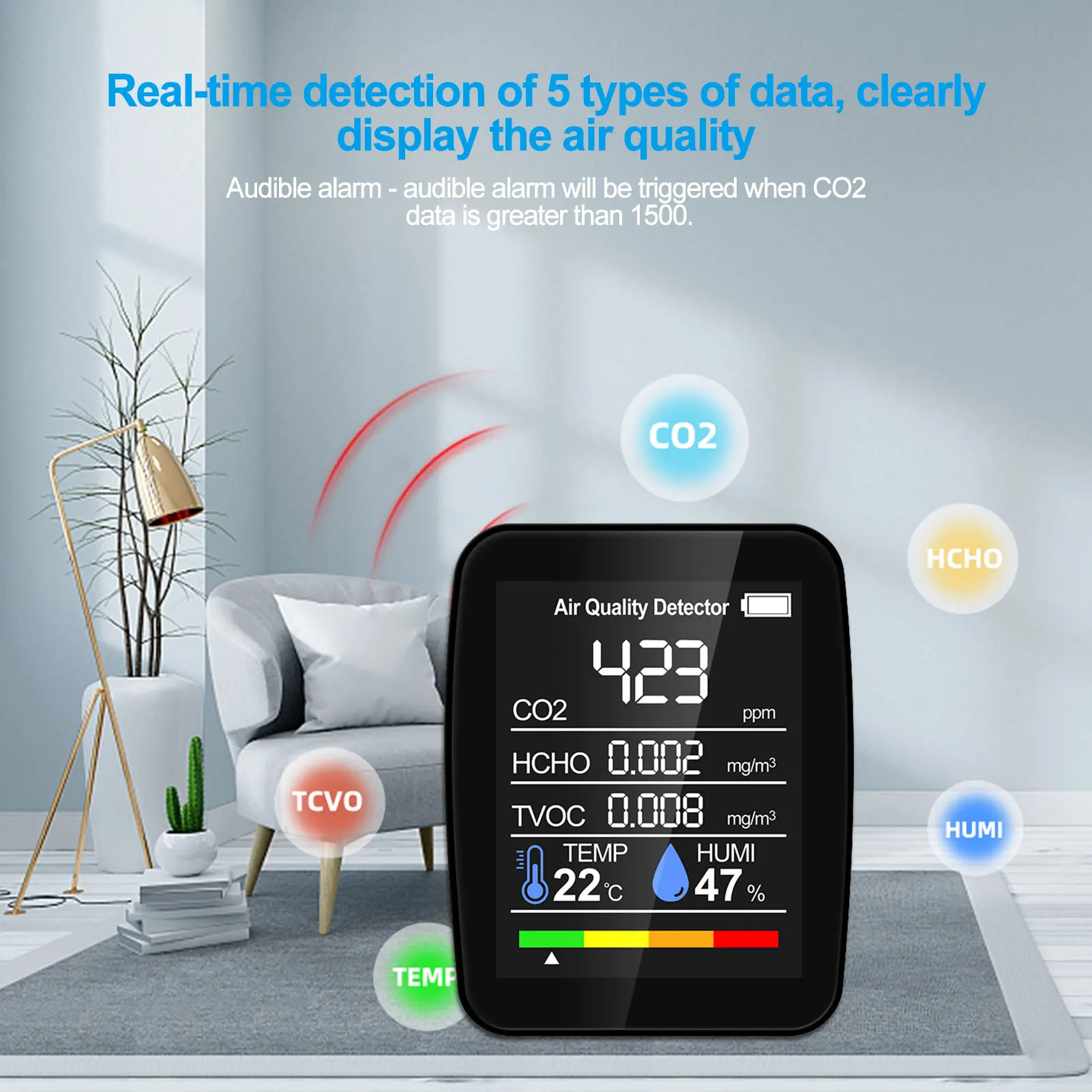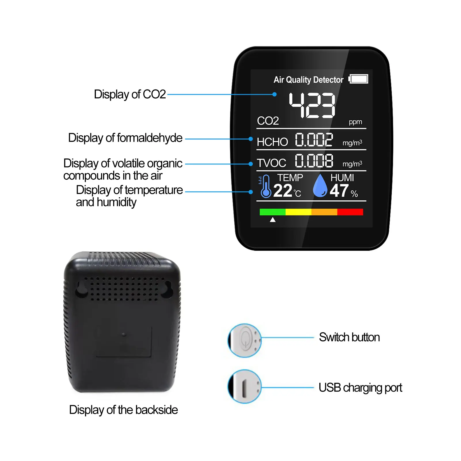 1. 5-in-1 монитор качества воздуха: 5 функциональных инструментов для обнаружения углекислого газа используют полупроводниковые датчики TVOC, которые могут точно контролировать концентрацию CO2, TVOC, формальдегид, влажность окружающей среды и температуру в режиме реального времени.