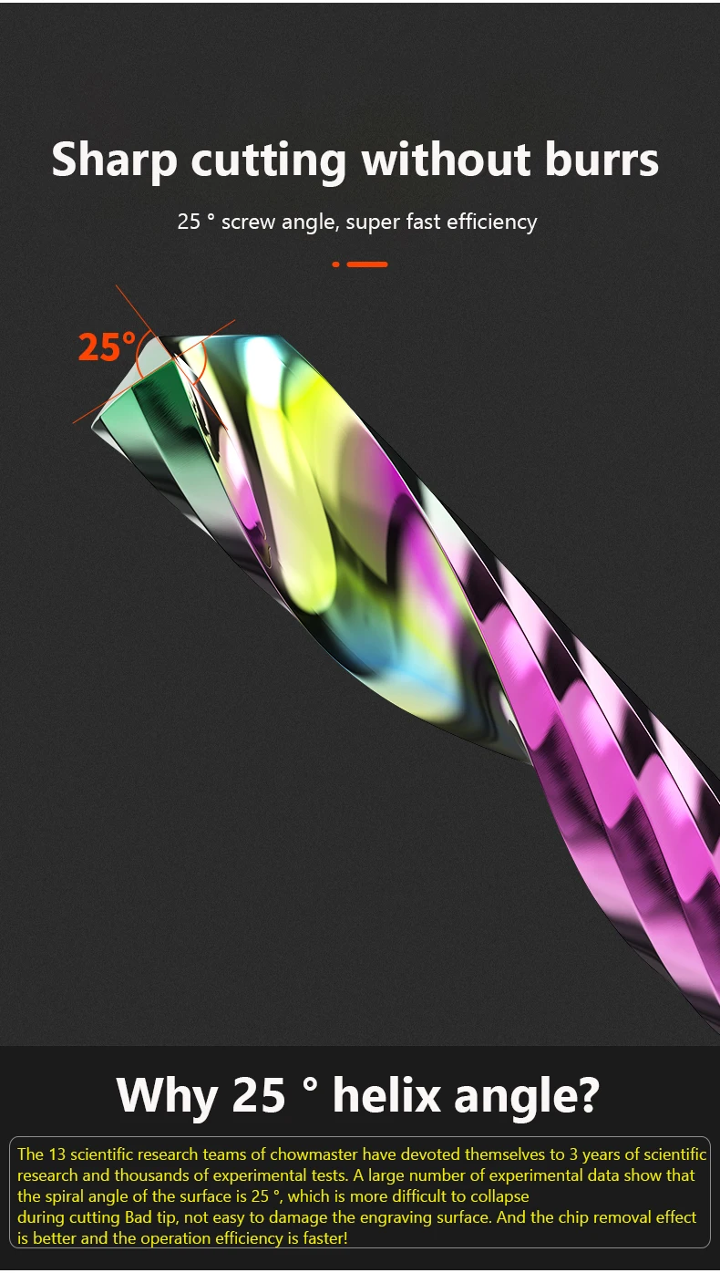 13 научно-исследовательских команд chowmaster посвятили себя 3 летним научным исследованиям и тысячам экспериментальных испытаний. Большое количество экспериментальных данных показывают, что спиральный угол поверхности составляет 25 °, что сложнее разрушить во время резки