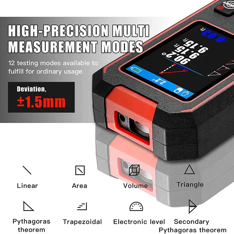 [Лазерный дальномер 196ft/60M] дальномер поддерживает 12 режимов тестирования, включая измерение длины, площади, объема, непрерывного измерения для максимального/минимального значения, теоремы Пифагора, измерение треугольника и трапеции. Стандартный Уровень 2, Space warp репер переключатель, +/-1,5 мм отклонение, оптические линзы фокусировки, традиционные ограничений. Широко используется как внутри, так и снаружи, настоятельно рекомендуется мастером дизайна.