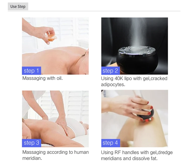 Используя собранную сильную звуковую волну, взрывную жировую головку излучаемых звуковых волн 40 кГц в человеческом теле, после того как она позволяет жировым клеткам организма производить сильное воздействие, может эффективно сжигать калории, влага и жировые клетки, жировые клетки уменьшаются, чтобы достичь эффекта удаления жира.