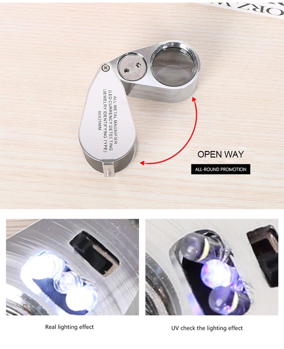 40X увеличительное стекло Карманный складной полностью металлический Ювелирные изделия Лупа Светодиодный УФ детектор валюты лампа оценка сбор антикварных ремесел