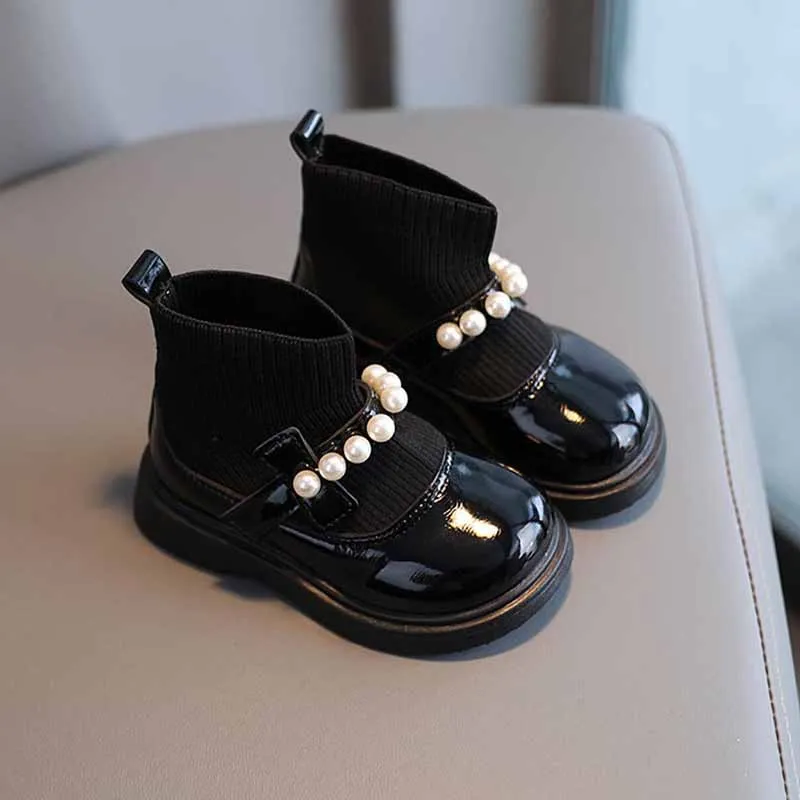 Spring Girls Children's Mary Jane Shoes Toddler Baby Kids Socks High Top Pearls Princess Leather Shoes White chaussure fille New 1 2 3 4 5 6 years old