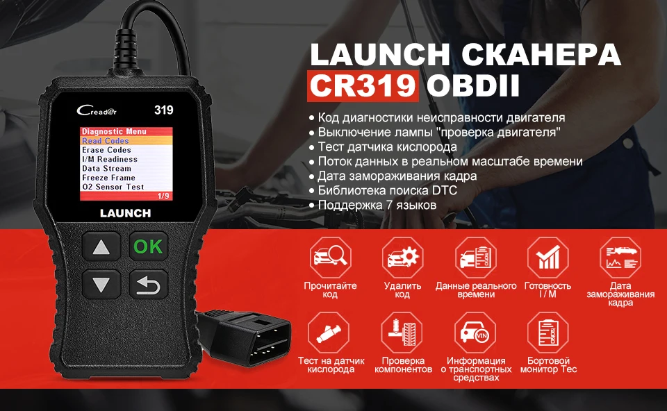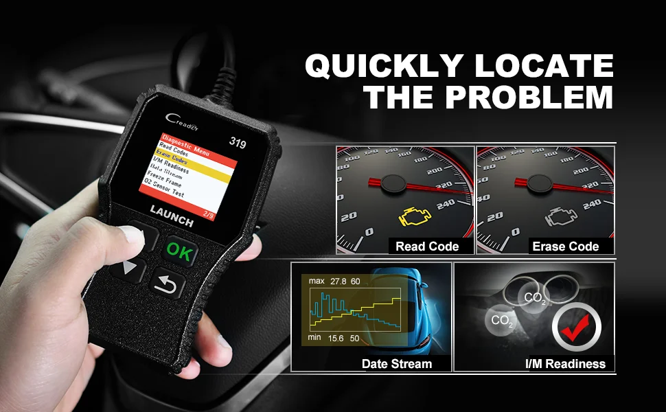LAUNCH CR319 со всеми режимами функций OBDII, DTC Lookup, Plug and Play и т. д., это действительно идеальный выбор начального уровня по простоте и доступности, позволяющий пользователям DIY проверять ремонт, дорожные испытания, проверять состояние монитора выбросов и решать проблемы. основные проблемы с двигателем и управляемостью.