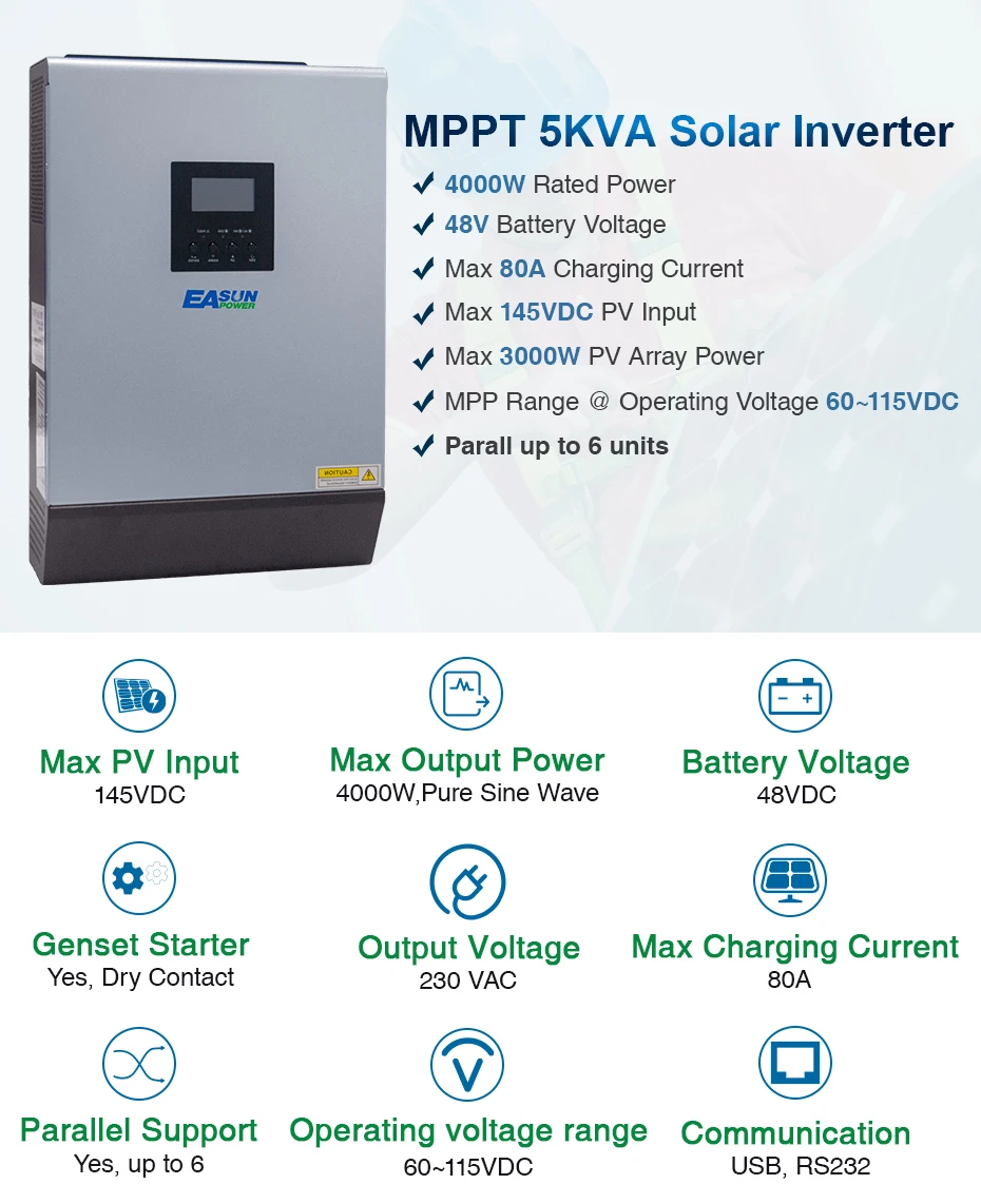5KVA солнечный инвертор 4000W 48V 230V инвертор с чистым синусом Гибридный инвертор Встроенный 60A со слежением за максимальной точкой мощности, неэлектрифицированная блок управления установкой на солнечной батарее Батарея Зарядное устройствоЭто со слежением за максимальной точкой мощности, солнечный инвертор 5Kva 4000w решеточный Инвертор 48В до 220V 60A со слежением за максимальной точкой мощности по ограничению на использование опасных материалов в производстве электрического и электронного оборудования синусоидальный инвертор Гибридный солнечный инвертор Встроенный MPPT Контроллер заряда для фотоэлектрических систем и Батарея Зарядное устройствоДизайн с вход переменного тока/выход 220-240 В переменного тока однофазный только. (Не Разделение фазы 110/220vac)