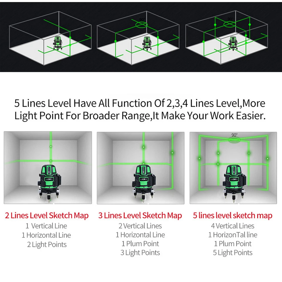Лазерный уровень 5 линий: 5 линий 6 точек (4 вертикальные, 1 горизонтальные, 1 точка вниз, 5 улучшенных точек)
