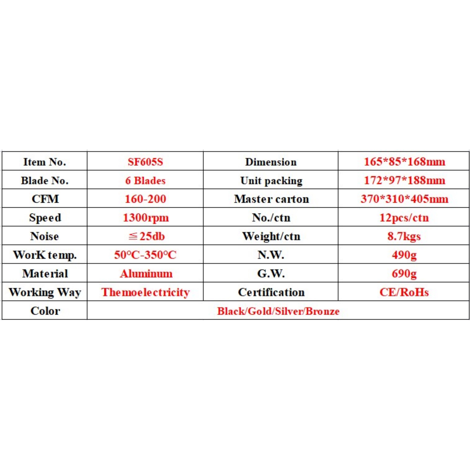 Ультра-тихая работа: 6 алюминиевых лезвий тщательно изготовлены и протестированы центрифугой, с хорошим балансом, безопасный светильник, и скорость может достигать 170-190CFM.