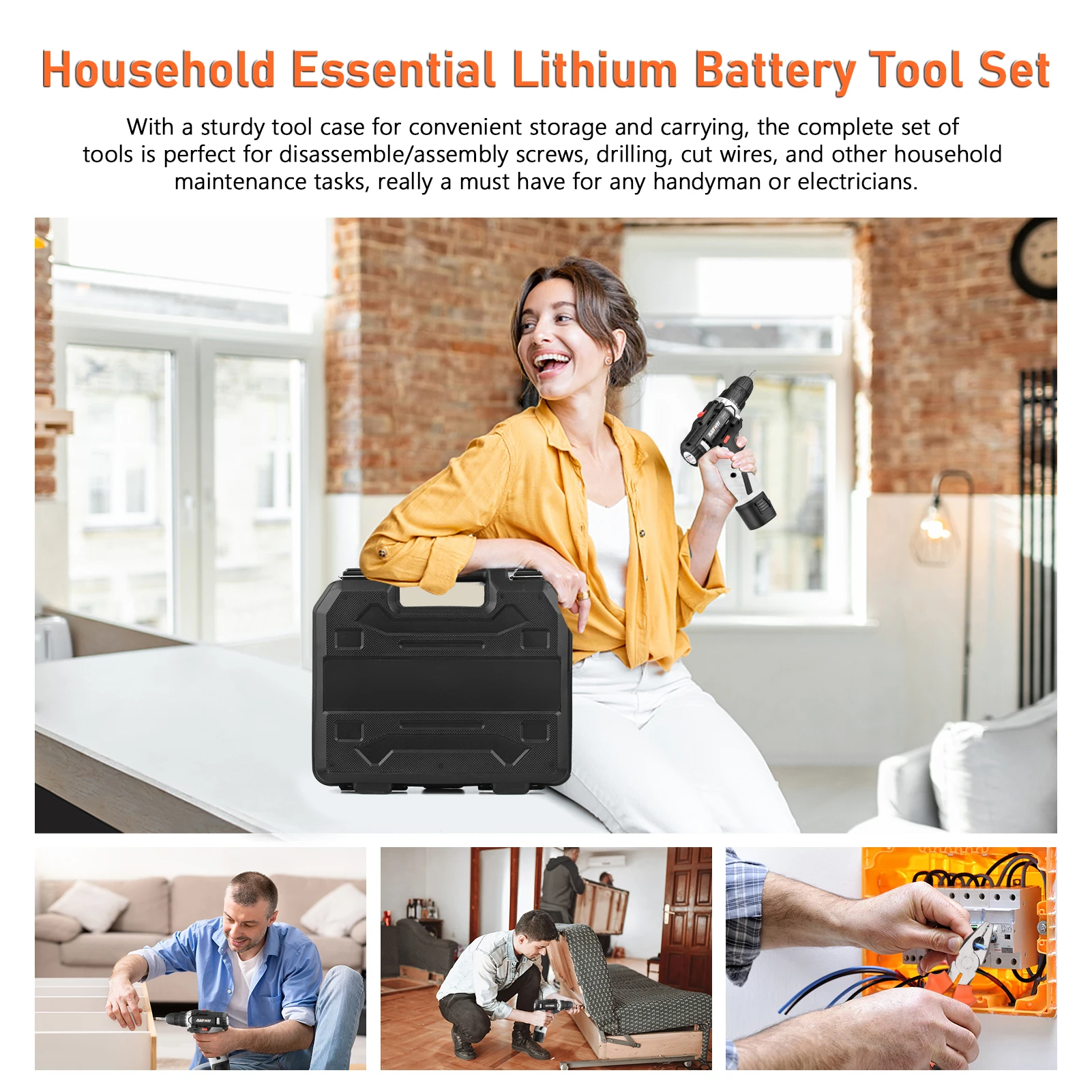 Набор инструментов для бытовой литиевой батареи: Прочный чехол для инструментов для удобного хранения и переноски, полный набор инструментов идеально подходит для разборки/сборки винтов, сверления, резки проводов, И другие бытовые ремонтные задачи, действительно должны быть для любого работника или электрика.
