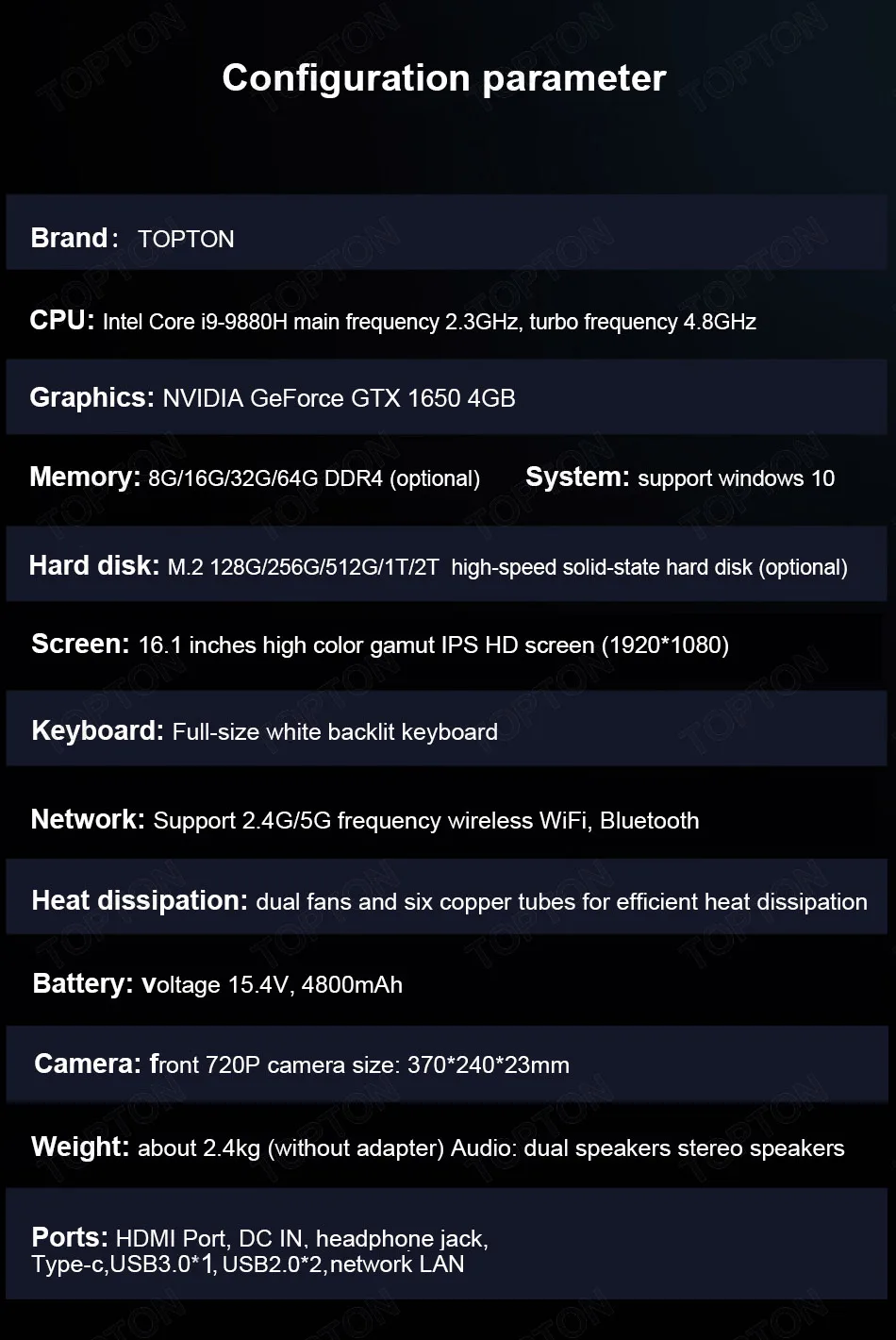 Основная информация | Бренд: TOPTONМодель: L6Операционная система: Windows 10Процессор: Intel Core i5/i7/i9Батарея: 4800 мА-ч/15,4 VМатериал: металл (крышка A/ D), пластик (крышка B/ C)Цвет: серый |