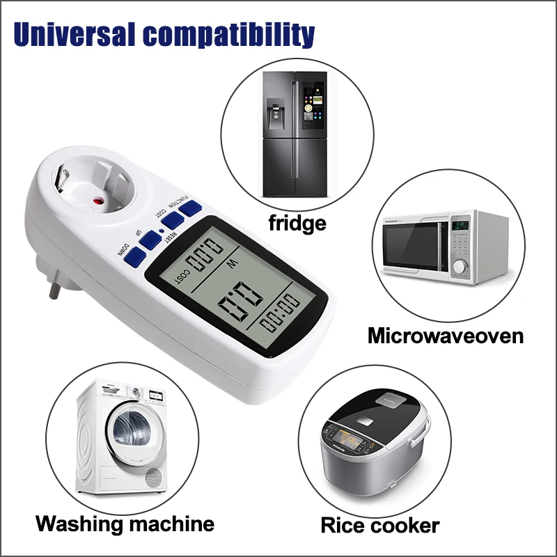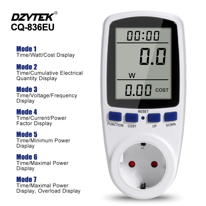 4. Широкое использование: этот монитор использования электроэнергии измеряет различные параметры: Мощность (Вт), энергия (кВтч), вольт, ампер, герц, коэффициент мощности и Максимальная мощность (Вт), время, дней-кВтч является жизненно важным, так как это то, на чем основаны ваши счета за электричество.