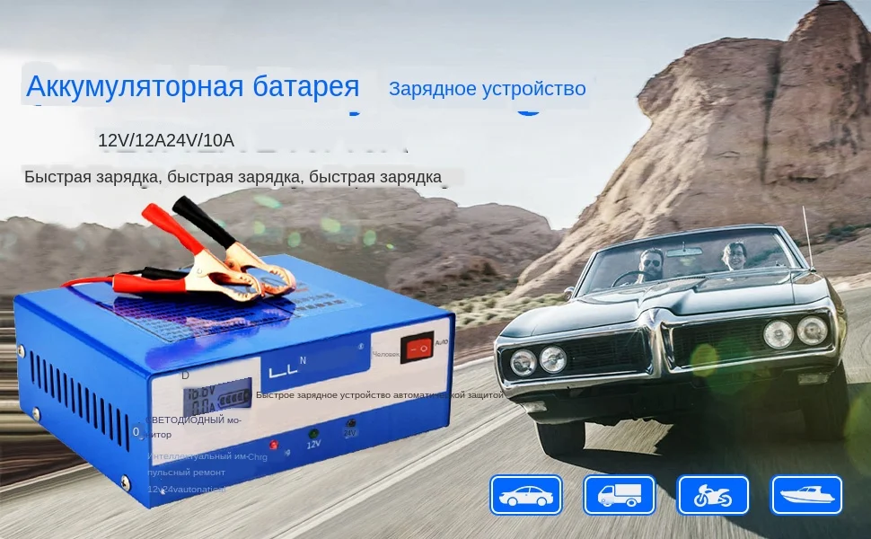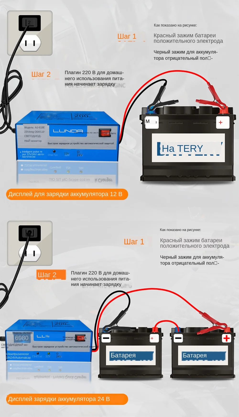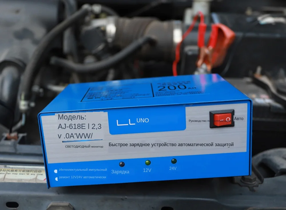 Данное зарядное устройство 618G специально разработано и изготовлено для свинцово-кислотных, сухих аккумуляторов 12 В/24 В, водяных батарей, свинцово-кислотных батарей без обслуживания Номинальный теоретический ток: 12V-12A (макс.) 24V-10A (макс.). Пожалуйста, убедитесь, что выход зарядного устройства совпадает с напряжением вашего аккумулятора.